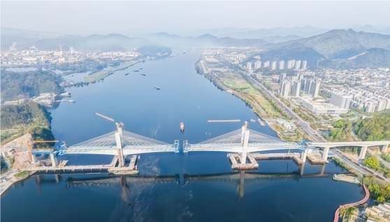 新安江特大橋位于浙江省建德市境內該橋全長885.2米,跨越寬度為520米的江面,采用主跨為216米的矮塔斜拉橋設計,是目前國內跨度最大的墩塔固結、塔梁分離式雙塔雙索面半漂浮體系矮塔斜拉橋,技術難度與施工精度要求極高。大橋共設4個主塔,36根斜拉索,最長索長達200米,是金建高鐵重難點工程和標志性工程,也是全線施工難度最大的橋梁控制工程,現(xiàn)已完成中跨合龍全橋貫通。